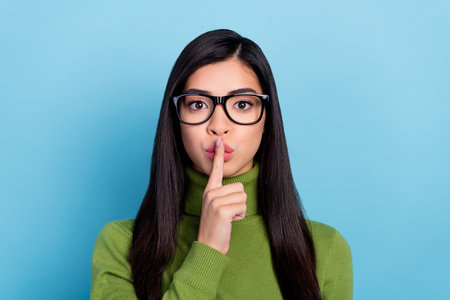Photo portrait woman in casual clothes keeping finger near lips secret isolated vibrant teal color background