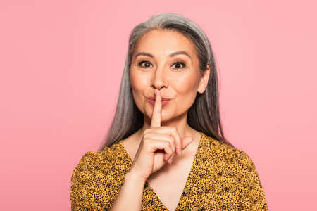 positive gray haired woman showing hush sign while looking at camera isolated on pink