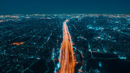The highway is illuminated by streaks of light from moving vehicles, with a bustling city skyline in the background under a dark night sky.