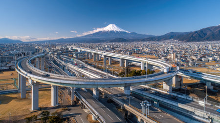 Aerial, wide-angle photograph captures a complex, elevated freeway interchange with multiple levels of curving roadways supported by tall concrete pillars. In the background, a dense cityscape stretches out beneath the majestic, snow-covered summit of a large stratovolcano, all visible under a clear, bright blue sky during the day.