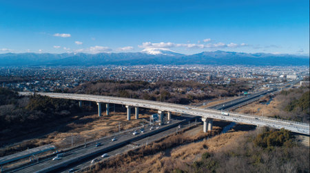 Aerial perspective captures a multilevel transportation scene featuring an elevated road structure spanning over a wide, multi-lane ground-level freeway. Beyond the immediate foreground, which consists of dry, brown winter vegetation, a dense urban area stretches across the middle ground, culminating in a dramatic background of large, imposing mountains, one of which has a noticeable snow-covered summit under a bright blue sky.