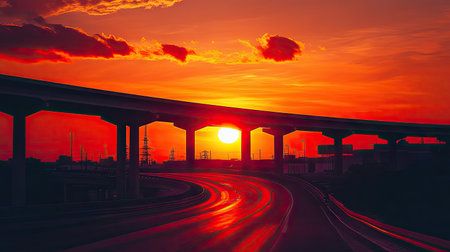 Long expressway overpass casting shadows in front of a glowing red-orange sunset, evoking motion and serenity.