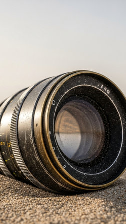 A vintage camera lens, centered and sharp, sits on dusty sand, dominating the lower half of the fram