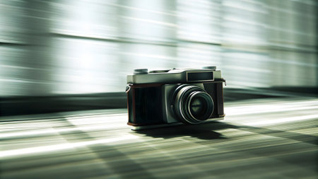 Vintage camera encapsulated in a swirl of dust particles, creating a dynamic effect. The focus is on the metal lens and dials, surrounded by bokeh and softly diffused light