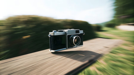 A captivating shot showcasing a camera capturing a vibrant mountain landscape. Colorful lines create a sense of motion, embodying adventure and exploration.