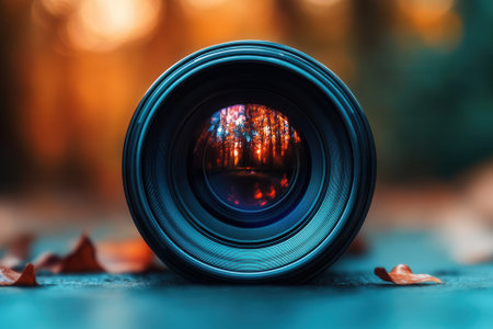 Autumn forest reflected in camera lens.