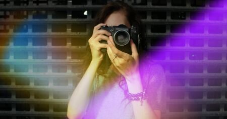 Portrait of pretty young woman with vintage camera takes photo of you, copyspace, colorful light leaks over the frame