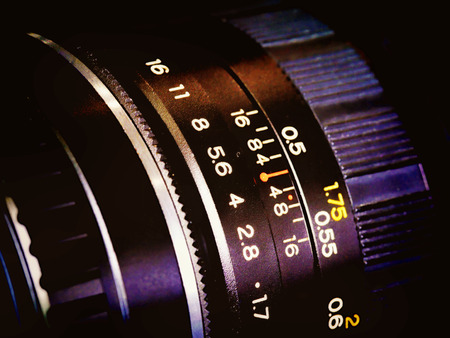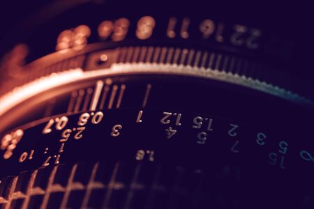 Macro and shallow depth of field image (selective focus) with the markings on the lens of a very old bellows photo camera (exposure time and f-stops).