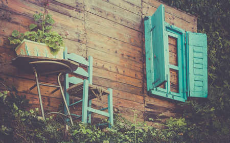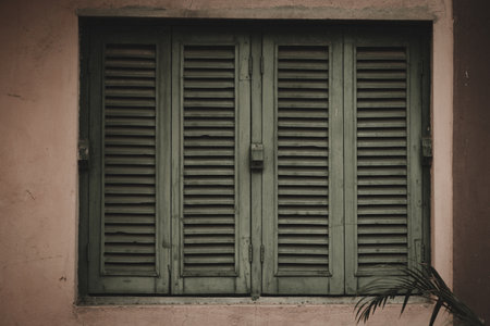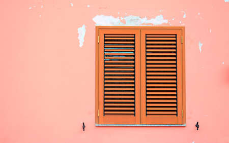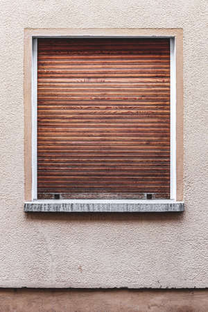 Old building exterior in Bamberg, Germany. Window with closed wooden shutter. Warm colors, minimalistic design. Home, architecture concept.