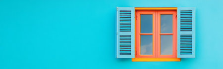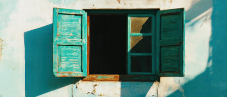 Vibrant painted wooden shutters open against a weathered wall in bright sunlight