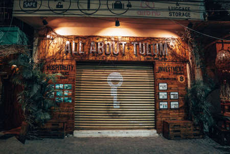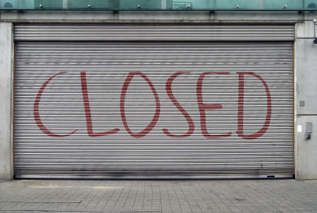 street store close or lease amid the coronavirus pandemic. small shops had to close due to the economic crisis and lack of tourists. a closed sign on the old metallic roller shutter door.