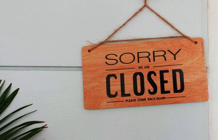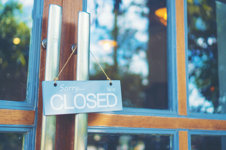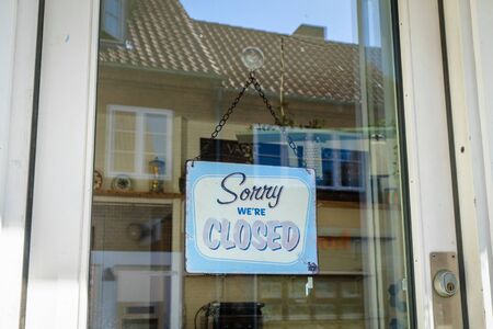 sorry we are closed sign hanging outside a restaurant, store, office or other. Closed sign in a shop showroom with reflections bokeh.
