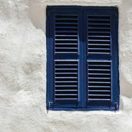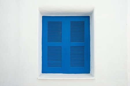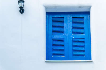 Typical architecture in Akrotiri village on Santorini island, Greece. White house with blue wooden window. Greek culture. Traditional colors