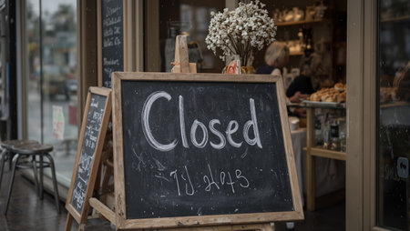 Rainy day bakery closure sign with handwritten Closed in white chalk Aroma of fresh bread