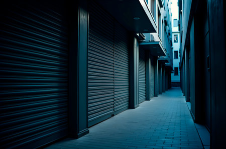 Dark Alleyway with Closed Rolling Shutters and Paved Ground