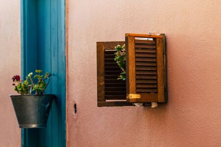 Athens Greece September 4, 2019 View of colorful window on a facade of a building in the Plaka neighborhood in the late afternoon