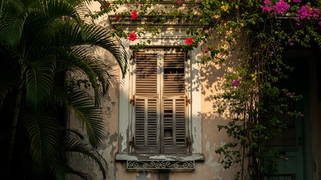 An old, weathered window with closed wooden shutters, surrounded by vibrant pink bougainvillea flowers and palm leaves. The peeling paint and rustic texture contrast with the fresh tropical greenery, suggesting a Caribbean or Mediterranean setting.