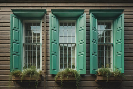 Colorful wooden shutters framed by lush greenery in a vibrant setting