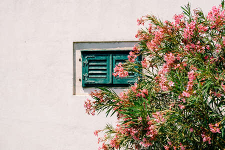 Oleander bush during flowering against a white wall with a window with green shutters.