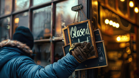 A person warmly dressed is closing a door while holding a sign in a vibrant urban setting. Soft lights reflect in the window, creating a cozy atmosphere.
