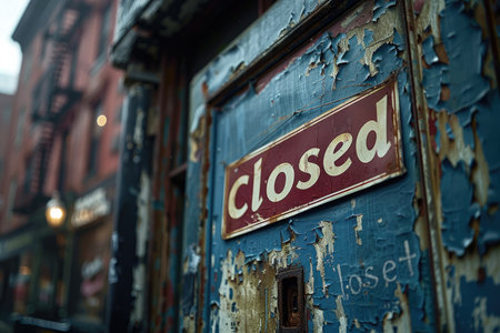 A colorful closed sign on graffiti-covered shop shutters in an urban setting