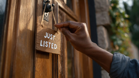 A person is holding a sign that says Just Listed on it. The sign is hanging on a door