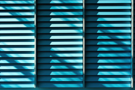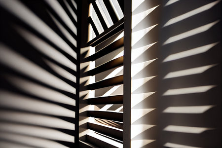 Soft sunlight filters through blinds, creating a mesmerizing display of light and shadow. This peaceful scene captures the essence of morning and evening tranquility.