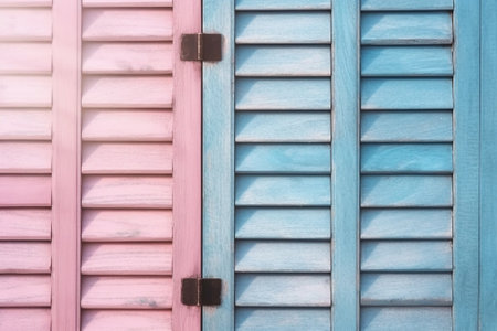 Colorful wooden shutters framed by lush greenery in a vibrant setting