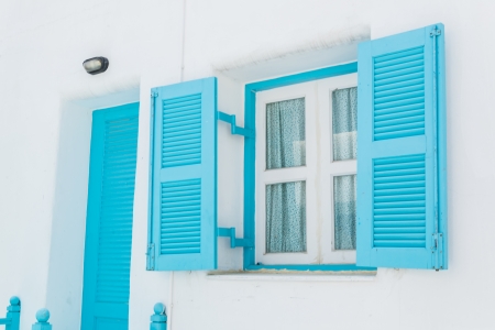 A charming blue shuttered window set against a white wall, showcasing architectural beauty and vibrant color contrast, perfect for summer scenes or cozy home designs.