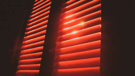 Closed blinds in dark room. Sun shine with rays outdoor.