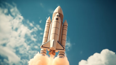 Rocket ship in the clouds shuttle cartoon Generative AI. Created with Generative AI technology