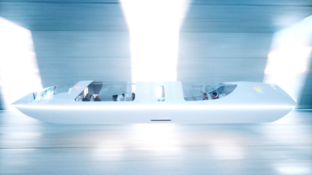 futuristic flying bus with peoples fast driving in sci fi tunnel, coridor. Concept of future. 3d rendering.