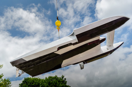 Hydroplane racing boat being lifted out of the water and moved overhead against a cloudy blue sky.