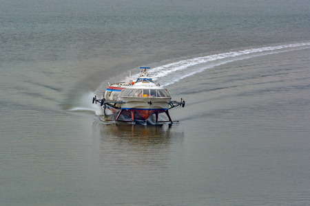 The passenger boat on hydrofoils going down the river Saigon (Song Sai Gon) on a sunny day. Vietnam, Southeast Asia