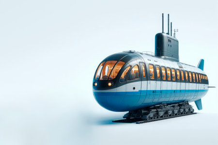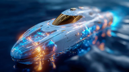 Futuristic deep-sea bathyscaphe submarine with glowing lights cruising underwater, ocean exploration and research concept.