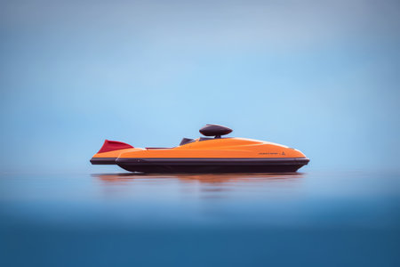 hovercraft featuring a blue background reminiscent of annibale carracci's style. the design is clean and simple, inspired by cinquecento art. alessandro gottardo's influence is evident in the colorization, with light white and orange hues. the image is perfect for ad posters, combining classic artistry with modern transportation. ai generated