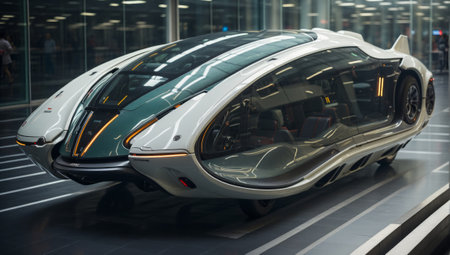 A detailed view of a futuristic spacecraft showcased in a high-tech interior, highlighting advanced design and features.