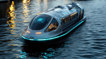 Sleek futuristic yacht sailing across calm ocean waters at sunset perfect for luxury travel promotions, high-end lifestyle concepts, and visions of the future.