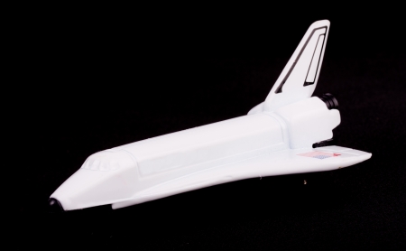 A detailed toy model of a space shuttle, showcasing its intricate design, is presented isolated on a clean white background.