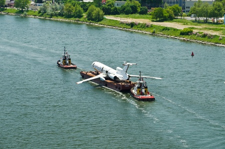VARNA, BULGARIA - MAY 23, 2011: Airplane is tolled on a platform on May 23, 2011 in Varna, Bulgaria. The old Tu-154 government plane, which belonged to Bulgaria’s communist leader Todor Zhivkov, will be submerged close to the coastal city of Varna and w