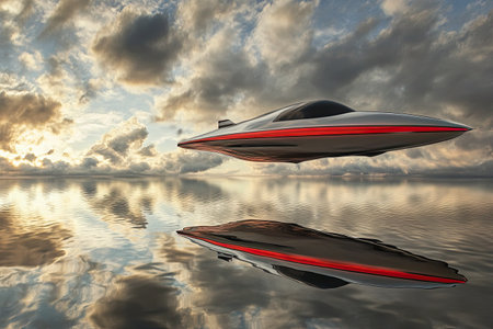 A sleek, retro-futuristic vehicle hovers above calm waters, mirroring a colorful, cloud-filled sky as dusk approaches.