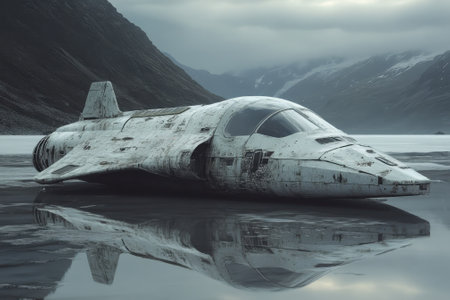 An old spacecraft is partially submerged in calm water, surrounded by towering mountains and a cloudy sky.