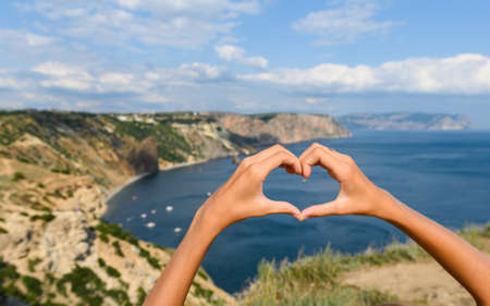 Hands of a girl in the shape of a heart against the background of mountains and the sea. Selective focus on hands. Travel lovers concept