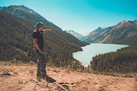 A man looking River from viewpoint along the walking trail to the Blue Lakes. a man in uniform points the way to the lake. Concept of Hiking and travel