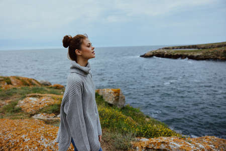 pretty woman in a gray sweater stands on a rocky shore nature Relaxation concept