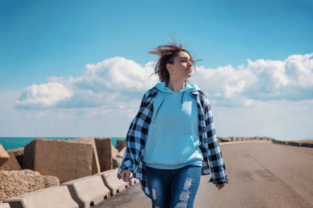 Short haired teenager in light blue hoodie and plaid shirt. Teen girl walking outdoor on the road and looking down, sunny day and blue sky. Clothing mockup, freedom adolescence concept
