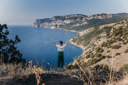 Beautiful young woman standing on a cliff of a mountain near the sea.