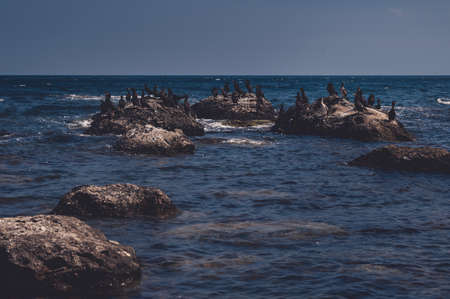 Beautiful view from the cliff on the blue sea. Incredible coast with freestanding cliffs in the sea. Cape Fiolent, Crimea.
