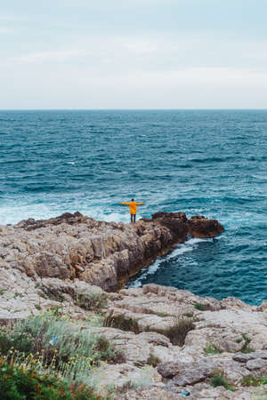Girl with opened arms on the edge of the cliff lookind at the sea