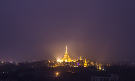 Shwedagon Paya pagoda in Gold Mist in the morning before sunrise .Myanmar famous sacred place and tourist attraction landmark.Yangon, Myanmar
